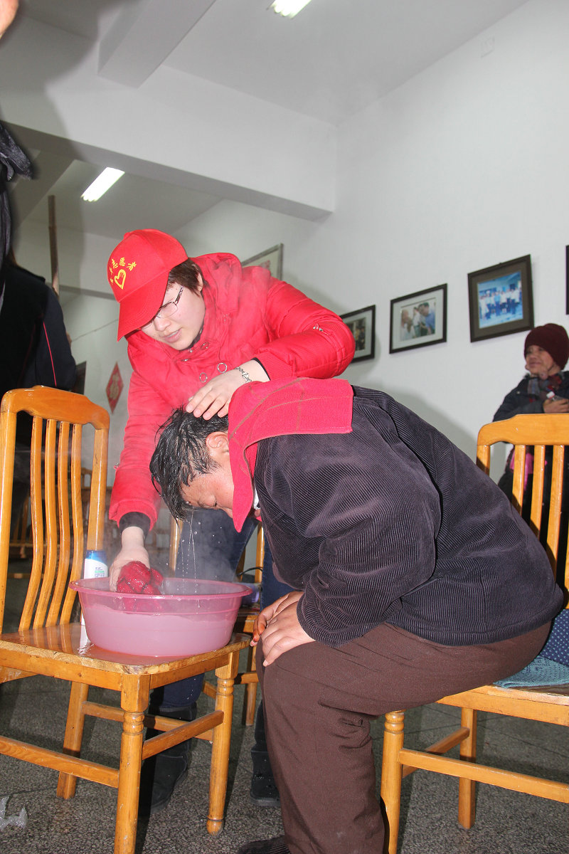 圖為集團志愿者正在為柯橋夕陽紅中心老人洗頭